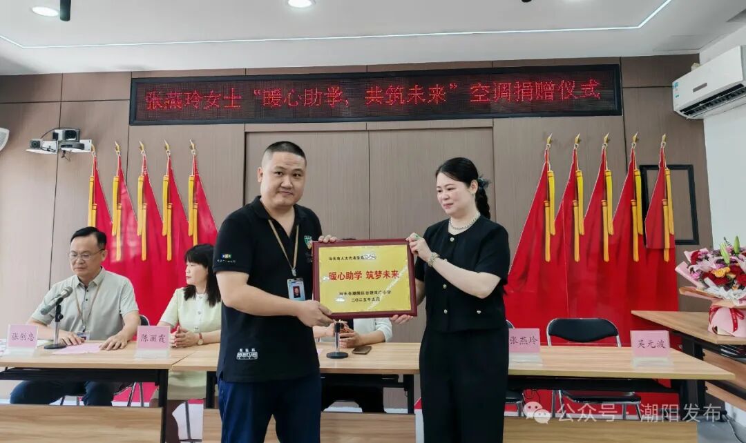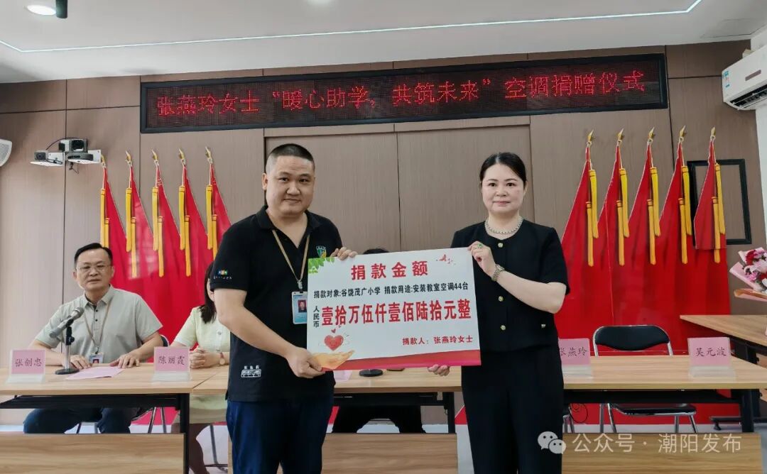 5月12日,汕头市人大代表、谷饶籍女企业家张燕玲女士“暖心助学·共筑未来”空调捐赠仪式在茂广小学举行。这是张燕玲女士暨五年前为母校教师办公室捐赠空调之后,再次捐资为母校教室安装44台空调,给茂广小学的孩子们“送清凉”。 仪式上,茂广小学校长上台接受张燕玲女士捐赠,并向张燕玲女士回赠“暖心助学·筑梦未来”牌匾,以此表达对她关爱母校、支持谷饶教育事业发展的深深谢意。 茂广小学有2400多名学生,学生人数在谷饶镇各小学排名第四,教室紧缺,学生拥挤,配套落后。为改善母校办学环境,张燕玲女士在2020年7月捐资6万多元为教师办公室安装了25台空调,大大改善教职员工的办公条件,让大家在舒适的环境中工作,也彰显了新时代女企业家“情系教育•造福桑梓”的大爱情怀。至今时隔五年,张燕玲女士再襄善举,又一次捐资10多万元为母校教室安装了44台空调,进一步改善孩子们的学习环境。至目前,无论是教师办公室还是学校教室,空调实现了全覆盖,全校师生从此告别了夏日闷热的教学环境。 从教师办公室扩展到学校教室,张燕玲女士热心助学的爱心善举不断升级。她用实际行动诠释了人大代表的社会责任与担当,展现了女企业家致富思源、回报社会的高尚品德。这份时隔五年的爱心延续,送来的不仅仅是“清凉”,更是在师生心中播下了感恩与奉献的种子。茂广小学表示,将以此为动力,进一步加强学校管理,推动教育发展,用知识助力孩子们改变命运,用文化提升孩子们的素养,用辛勤培育孩子们健康成长,接续传承爱心,为孩子们筑梦未来,全力助推谷饶教育事业高质量发展。