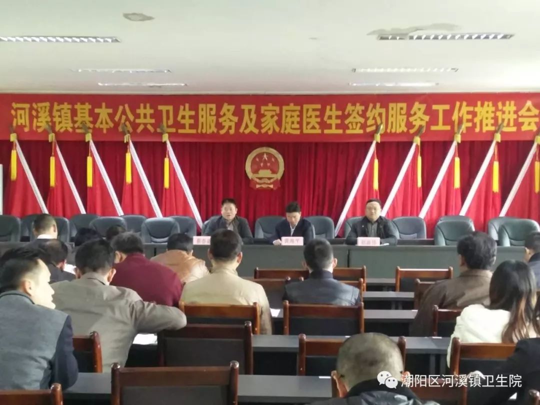 2017年12月19日在河溪镇镇政府三楼会议厅召开国家基本公共卫生服务项目和家庭医生签约服务工作推进会议,参加会议人员有区卫计局赵淑伟主任、镇政府黄海平主席、河溪镇卫生院负责人蔡春盛及全院院委、各家庭医生队长、村卫生站医生和各村管理卫生干部,会议由黄海平主席主持。