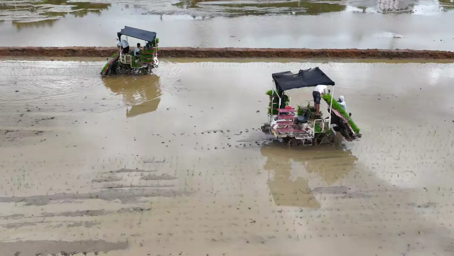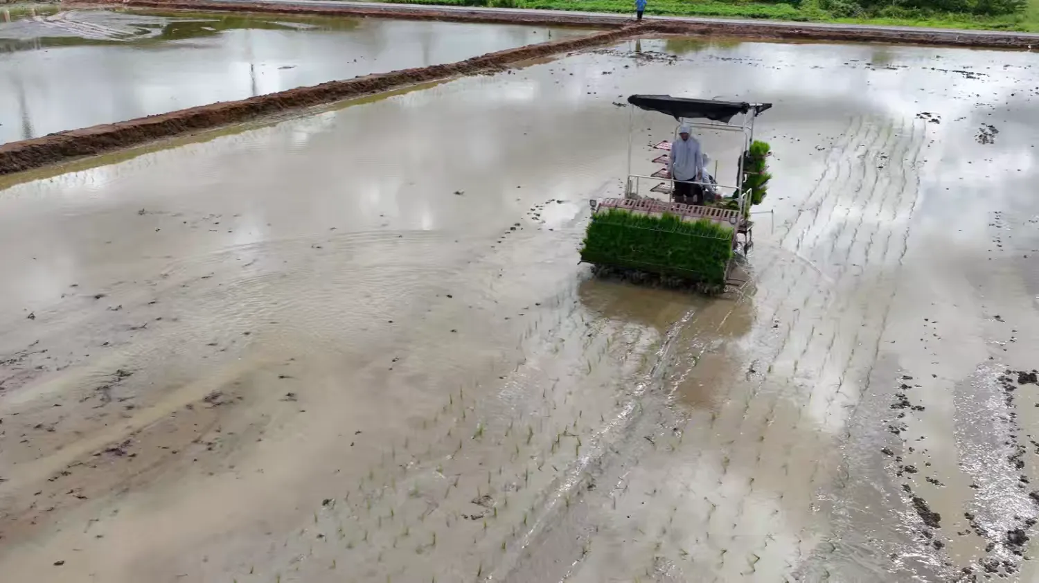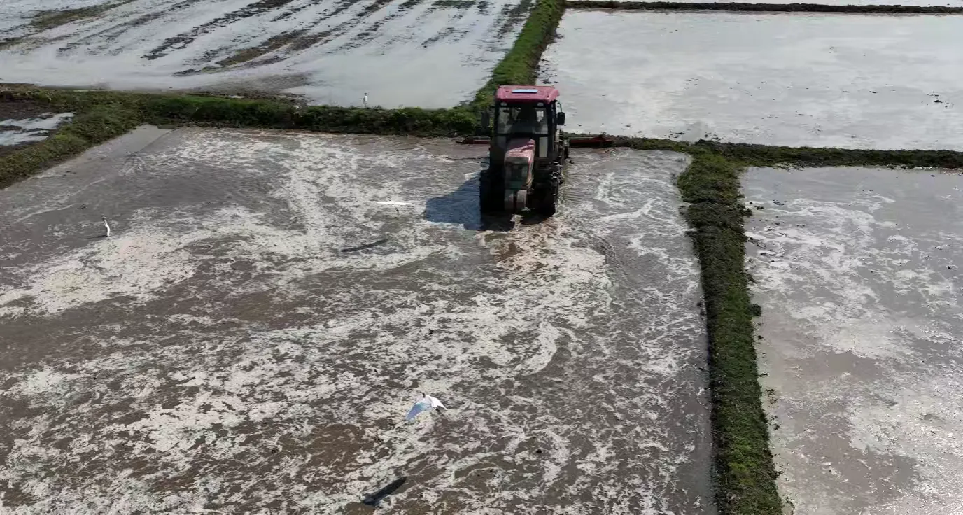 在金浦街道办事处门前,一台台现代化的播种机在田间有序作业,勾勒出一幅生动的秋耕画卷。当地农户们坐在插秧机上,娴熟地操作着农机设备,一排排嫩绿的秧苗如琴弦般在秋风中轻轻摇曳,奏响了一支丰收的前奏曲。