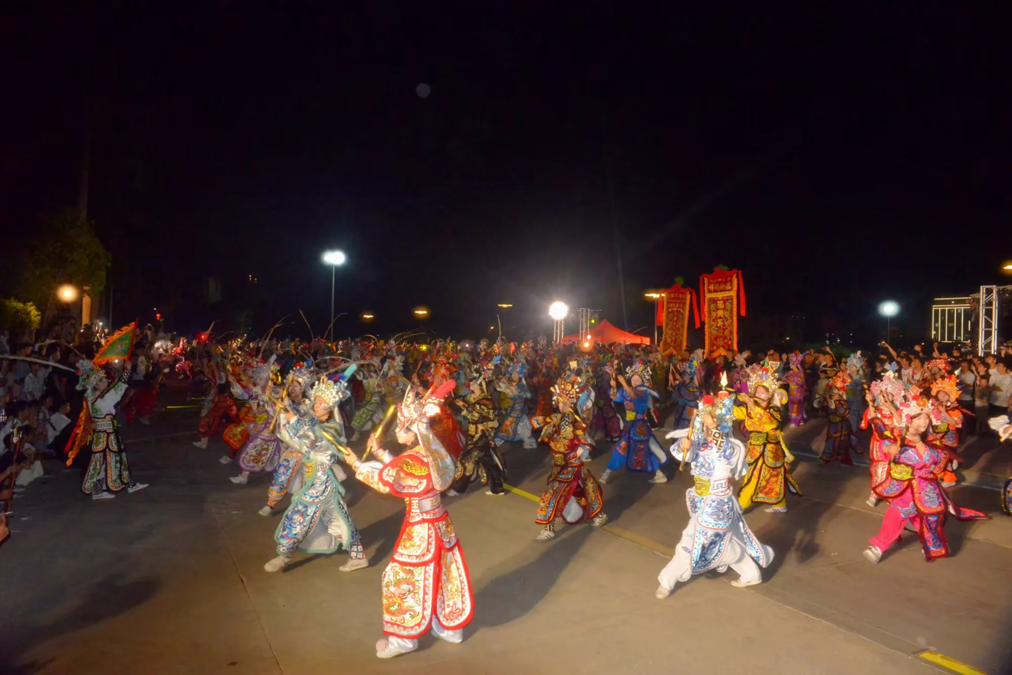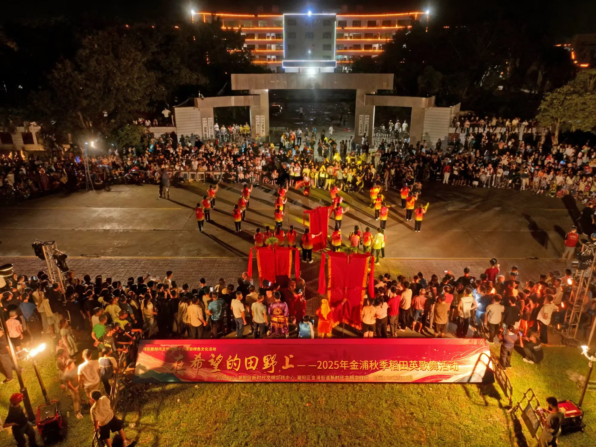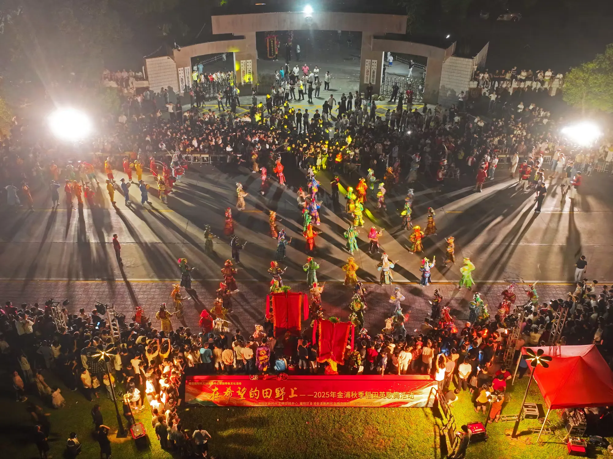 10月18日晚,金浦街道超级水稻休闲农场的稻田里,晚风轻拂稻浪,鼓点声划破夜空。“在希望的田野上—2025年金浦秋季稻田英歌舞活动”在此拉开帷幕,245名英歌队员用刚劲的舞姿,为在场观众献上了一场非遗与田园交织的视觉盛宴。
