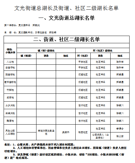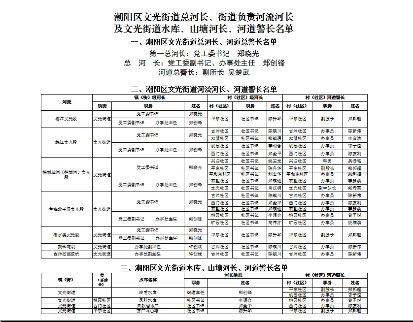 为进一步落实绿色发展理念,推进生态文明建设,维护河湖健康生命,完善水治理体系,落实管理责任,建立长效机制,确保全面推行河长制湖长制在我街道落地生根、取得实效,现将2019年调整后的《潮阳区文光街道总河长、街道负责河流河长及文光街道水库、山塘河长、河道警长名单》、《文光街道总湖长及街道、社区二级湖长名单》予以公示。