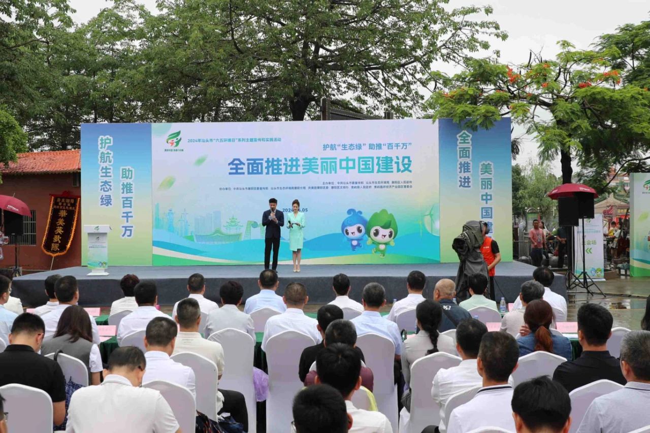 当前,高质量的生态环境建设仍在路上,需要包括广大志愿者在内的全体人民的共同参与。活动中分别为潮阳区、澄海区和潮南区的“汕头市生态环境志愿队”授旗。 ▲活动为“汕头市生态环境志愿队”授旗。 ▲活动为“汕头市生态环境志愿队”授旗。 ▲活动为“汕头市生态环境志愿队”授旗。 2023年全国最美基层环保人、汕头市生态环境保护综合执法局投诉举报科科长李海彬也来到了现场。李海彬的日常工作主要是负责组织、指导、协调和办理全市生态环境信访投诉案件。多年来,他24小时“带机”工作,以维护群众环保权益诉求为己任,在他的身上,集中体现了基层环保人的优秀品质和扎实的工作作风。 ▲李海彬领读倡议书。 ▲李海彬领读倡议书。 在现场,他领读倡议书,号召广大市民群众要主动投身于汕头生态文明建设,践行绿色、文明、健康的生活方式和消费理念,争做资源节约、低碳生活、绿色消费、环境保护的倡导者和行动者。 生态环境质量的提升 改善了人居环境 也为企业发展提供环境支撑 潮阳区贵屿镇的群众讲述整治后的练江重现龙舟赛的喜悦,澄海区东里镇的村干部分享当地群众身体力行参与生态文明建设的故事,潮南区陈店镇的企业代表则分享练江水质改善为当地纺织产业带来的新变化。 ▲澄海区东里镇群众接受记者采访。 活动还启动“助力百千万·走进母亲河”采风活动,由汕头融媒集团联合澄海区、潮阳区、潮南区的融媒中心组成联合采访团,深入各区镇村,开展系列新闻报道和短视频融媒传播。接下来,采风团将聚焦我市生态建设点滴变化,不遗余力讲好“汕头生态建设故事”。 ▲活动启动“助力百千万·走进母亲河”采风活动。 ▲活动启动“助力百千万·走进母亲河”采风活动。 ▲活动启动“助力百千万·走进母亲河”采风活动。 今年“六五环境日”主题宣传活动 我市创新形式 通过5G+高清视频连线的方式 同时在潮阳区贵屿镇 澄海区东里镇 潮南区陈店镇三地举办 活动现场分别举办精彩的潮汕文化节目,通过英歌舞、潮曲表演唱、机器人玩具表演以及绿色环保贴身服饰秀等,全景式、多维度地展示汕头生态环境建设地新成效,进一步扩大了宣传覆盖面,营造广泛支持、参与生态文明建设的浓烈氛围。 ▲活动现场举行英歌舞表演。 ▲活动现场举行潮曲表演唱。 ▲活动现场举行机器人玩具表演。 “全面推进美丽中国建设——护航‘生态绿’ 助推‘百千万’”汕头市“六五环境日”系列大型宣传活动的举办,进一步提升全民生态保护意识,久久为功、持续发力,用生态文明建设的更大成效,为“百千万工程”实施、汕头高质量发展增添更加浓烈的生态底色,推动习近平生态文明思想在汕头落实生根、开出硕果。